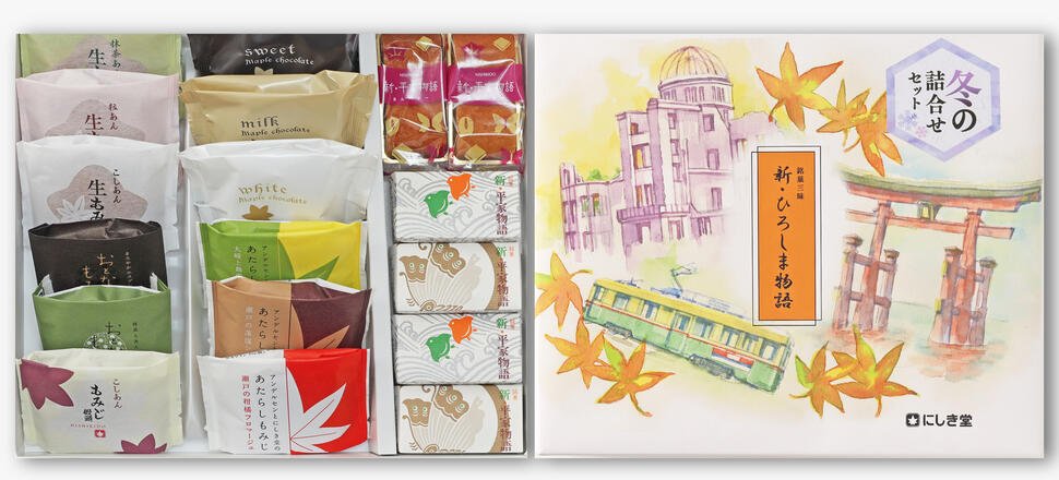おとなのもみじ(2種)、メープルチョコレート(3種)、あたらしもみじ(3種)、もみじ饅頭(こし餡)、生もみじ(こし餡、つぶ餡、抹茶)、新・平家物語、新・平家物語あんバター