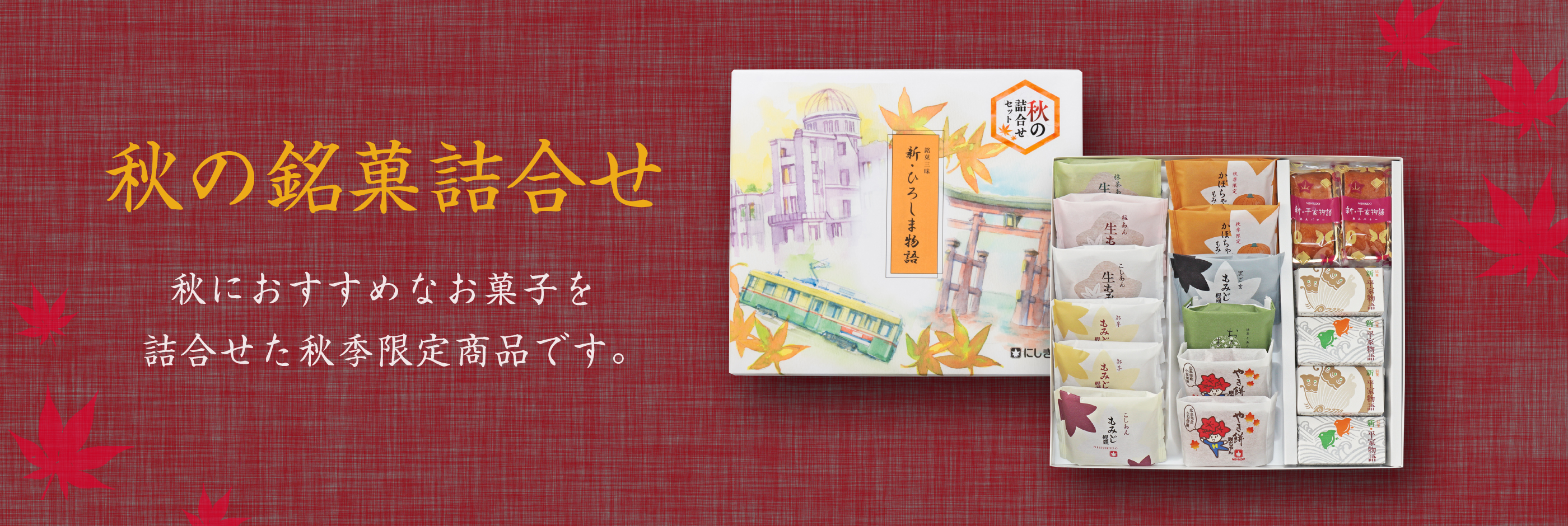 秋季限定の「かぼちゃもみじ」「やき餅咲ちゃん」、ほくほくのお芋餡が入った「お芋もみじ」などを詰合せています。