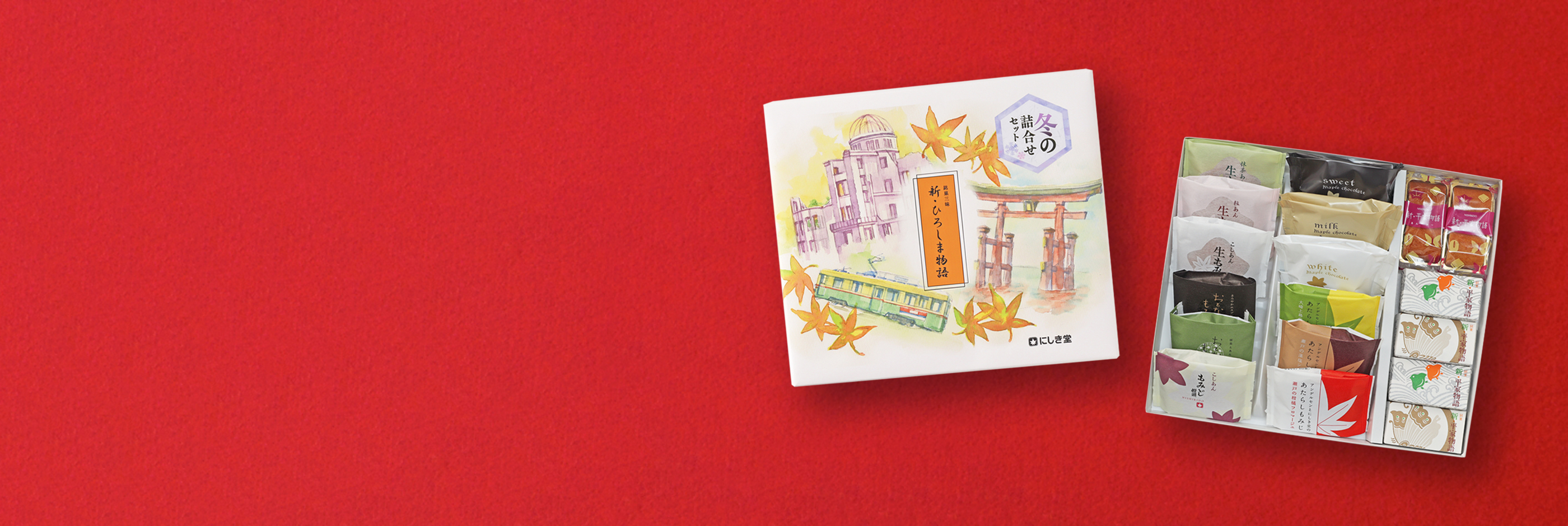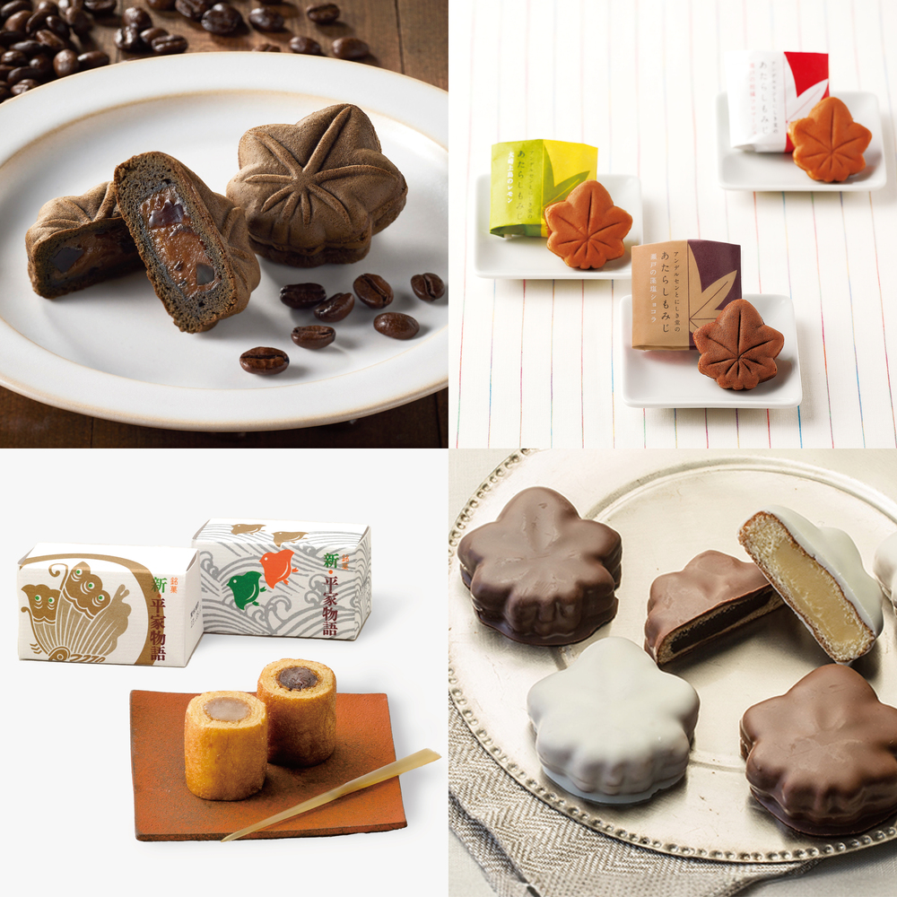 おとなのもみじ(2種)、メープルチョコレート(3種)、あたらしもみじ(3種)、もみじ饅頭(こし餡)、生もみじ(こし餡、つぶ餡、抹茶)、新・平家物語、新・平家物語あんバター