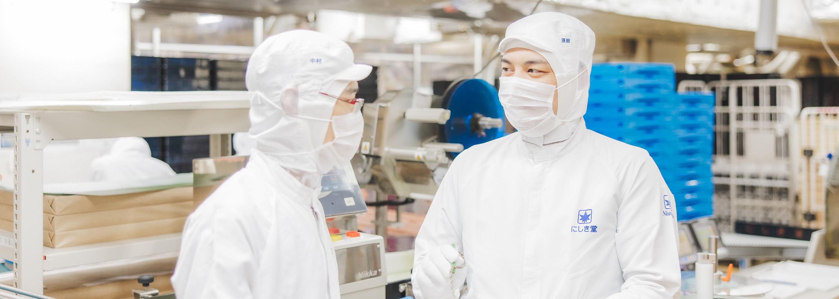 今では製造の仕事が自分に向いていると感じます。製造部門では、生地づくりから焼成、箱詰めまで、多くの工程を連携して進め、入社初期から現場で様々なスキルを習得しました。ベテラン社員は職人気質の方もいるため、わからないことは自分から積極的に聞くように意識しています。先輩方のように生地を触っただけで品質を見分けられるレベルを目指したいです。